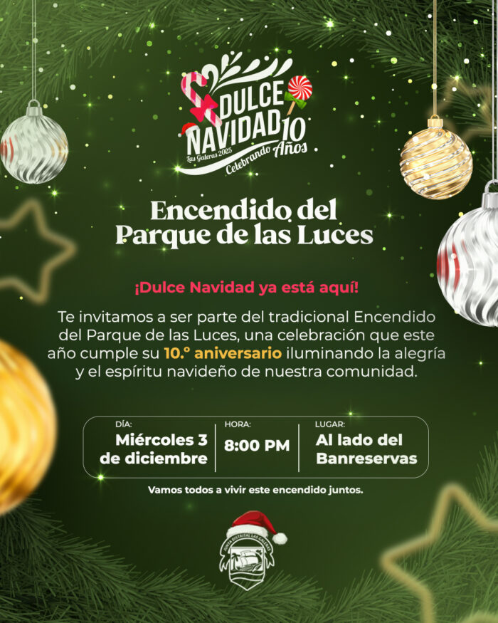 A las 8:00 PM celebramos el Encendido del Parque de las Luces y el 10.º aniversario de Dulce Navidad.